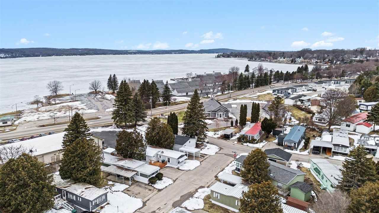 Enjoy Lake Charlevoix views from the spacious deck of this 2BR/2BA home in Lakeview Village. Features include an open floor plan, updated bathroom, and a mix of hardwood, carpet, and vinyl plank flooring. Kitchen offers updated vinyl flooring. Laundry room was previously a bedroom and could be converted back. Storage shed included. Newly built community clubhouse available for gatherings and events. Conveniently located near Lake Charlevoix and Boyne City's downtown shopping and dining, with a public beach and boat launch just across the street.