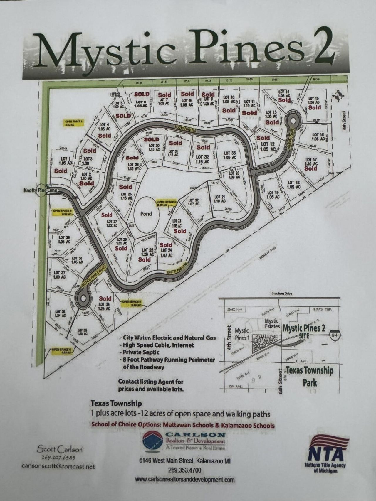 Last phase of Mystic subdivision; Mystic Pines 2 in Texas Township offering 39 Beautiful 1 acre plus residential wooded lots. Nature abounds, including 12 acres of open space, parks and walking paths. Many lots conducive for walkout or daylight basements. Several gorgeous lots with pond view. build with Carlson Realtors & Development or use your own approved Builder. Schools of choice available